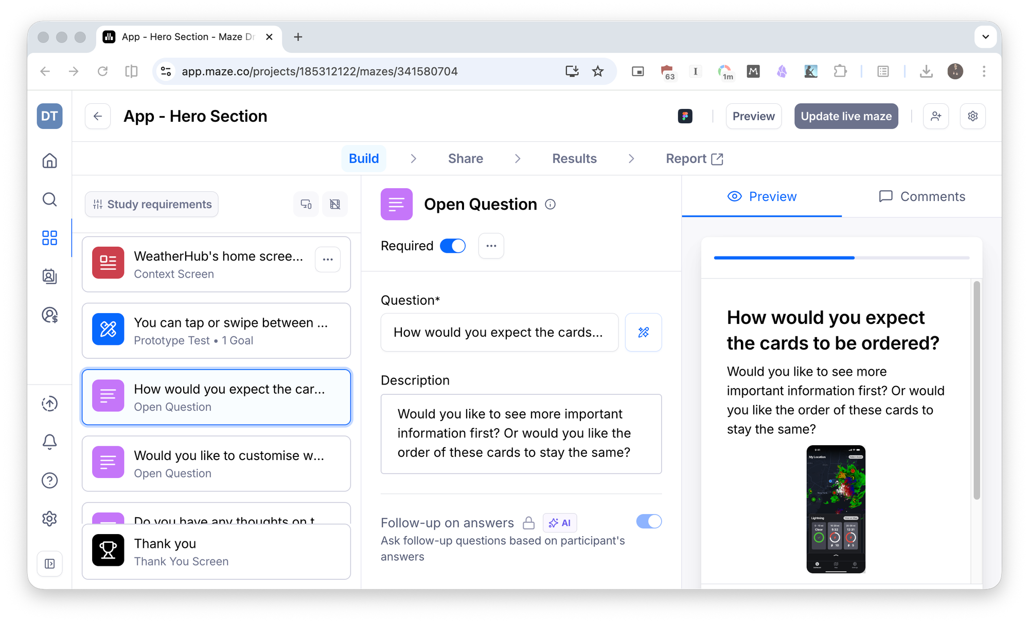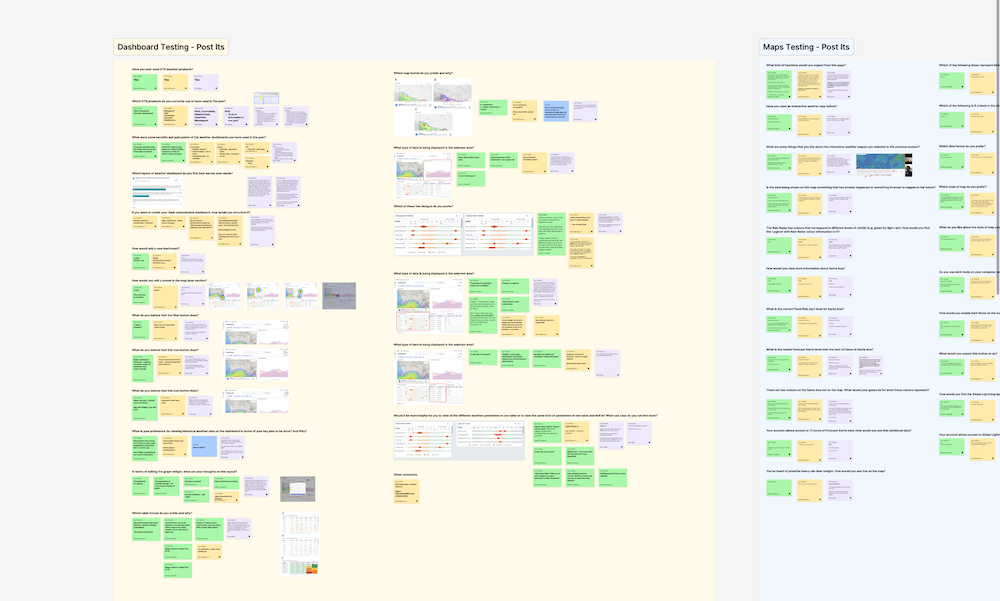 Vercel's generative design tool v0 allowed us to also create working prototypes to show to users, without engineering work. As well as lists of customers who are open to user testing, Maze links can be shared with users directly in the Weather Hub product.