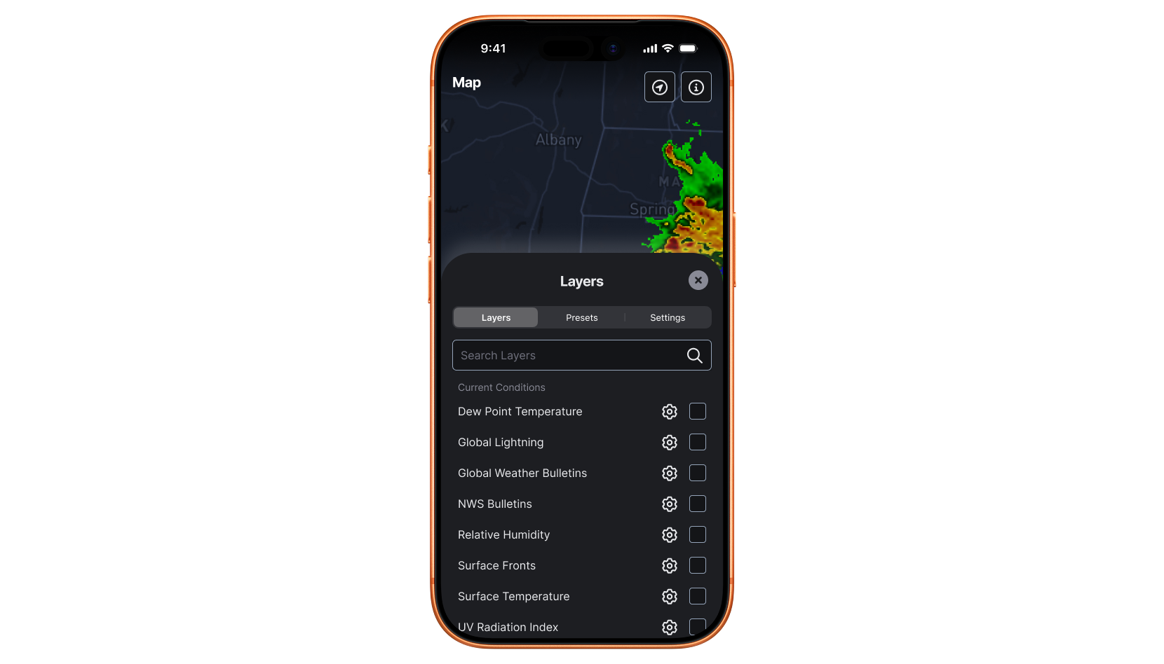 As a tool that comes with users in the field, the native Weather Hub mobile app places the Map front and centre on launch, with glanceability and relevant widgets shown before the fold. Relevant widgets reflect your current location, but users can also view widgets for specific locations too.